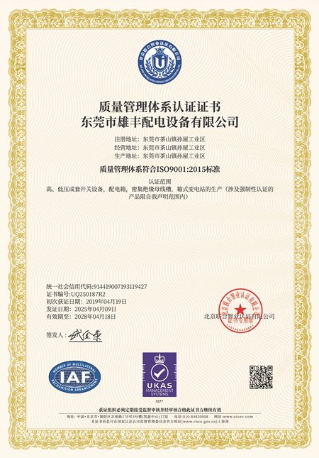东莞市雄丰配电设备有限公司是专业生产各种高/低压成套开关设备、集产品研发、制造及技术支持于一体的高科技企业。先后获得高新技术企业,民营科技企业等荣誉称号。是ISO9001:2015质量管理体系、ISO14001:2015环境管理体系、GB/T45001-2018职业健康安全管理体系认证及低压成套开关设备3C产品认证企业。现有数万平方米现代化园林式厂房及世界先进水平的数控剪床、数控冲床、数控折弯机床、自动化喷涂流水线及高、低压产品检测设备,工艺装备齐全。为能制造出性能优良、质量可靠的产品奠定了坚实的基础...